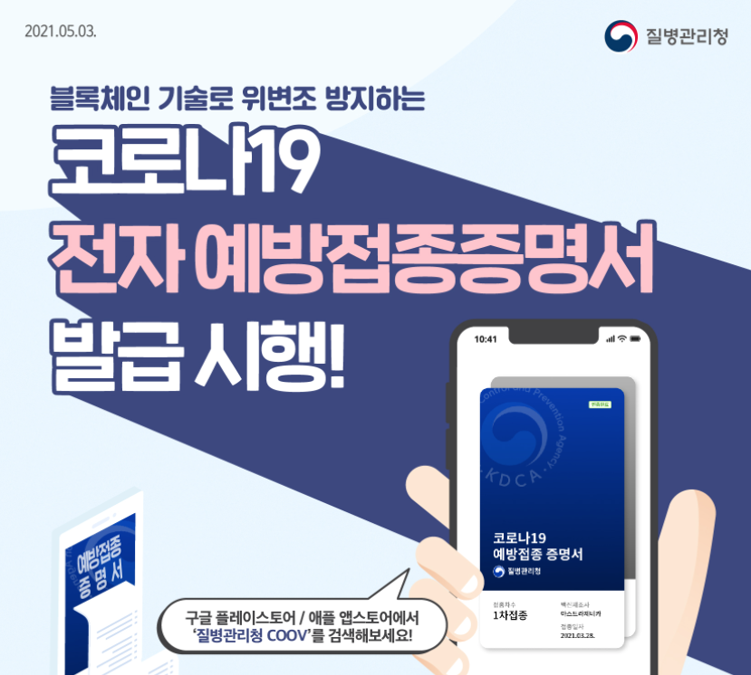 전자 코로나백신 접종증명서는 모바일을 통하여 구글플레이스토어나 애플 앱스토어에서 ‘질병관리청 COOV’를 검색하여 누구나 쉽게 설치가 가능합니다.
